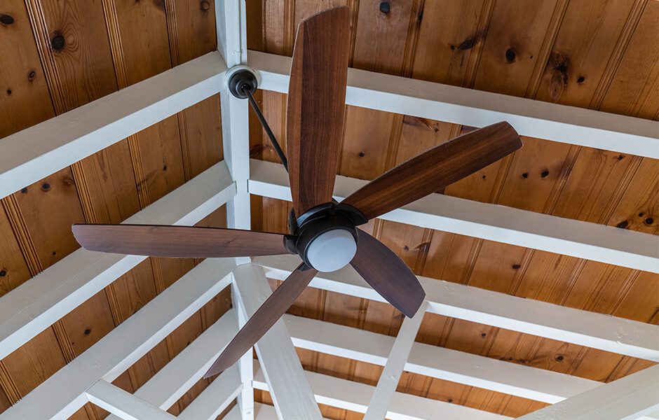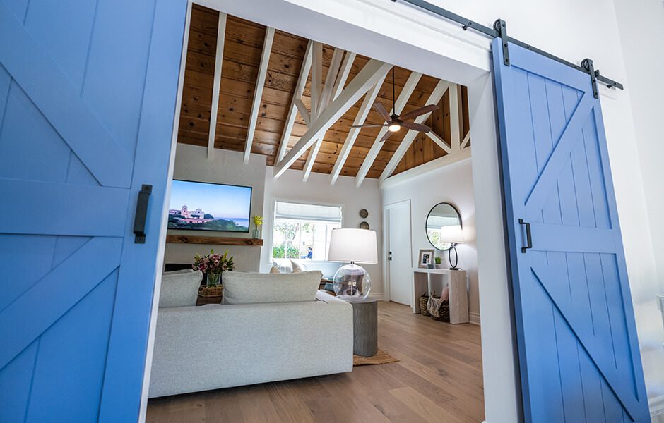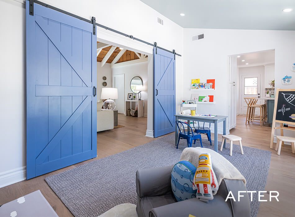 The kids’ room was a former outdoor space that hadn’t been closed in properly, so we spent a good bit of time fixing the floors and sealing it up to prevent future water damage. Once that was done, we went for bright colors that would encourage the boys to have fun and spark their imaginations: a light green on the ceiling, large-scale leaf-print wallpaper, and these standout blue sliding barn doors that easily help Janet and Kristopher keep an eye on the kids. (Check out the paint colors and wallpaper print in the Resource Guide above!)