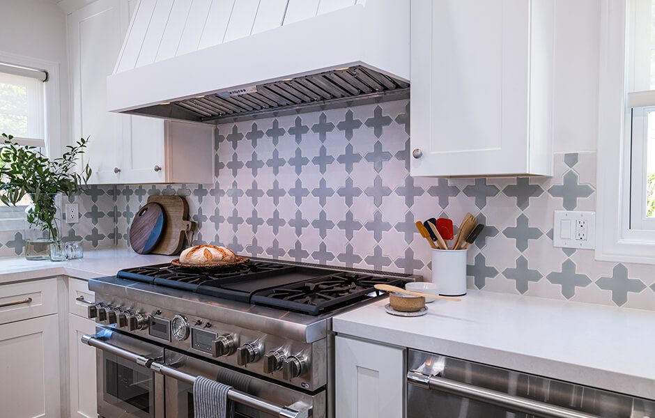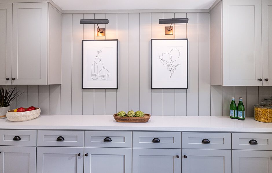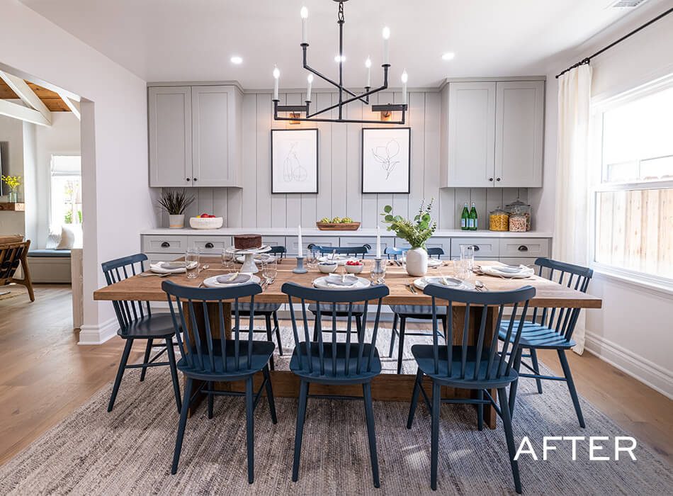 Janet and Kristopher’s dining room had become a makeshift storage space, so we created actual storage with a cabinet-lined wall and additional counter space. To tie the design together, we went with vertical shiplap that—thanks to Drew’s math skills—aligned perfectly with the light fixtures. We then carried the vertical shiplap into the kitchen, where we installed it on the new vent hood.