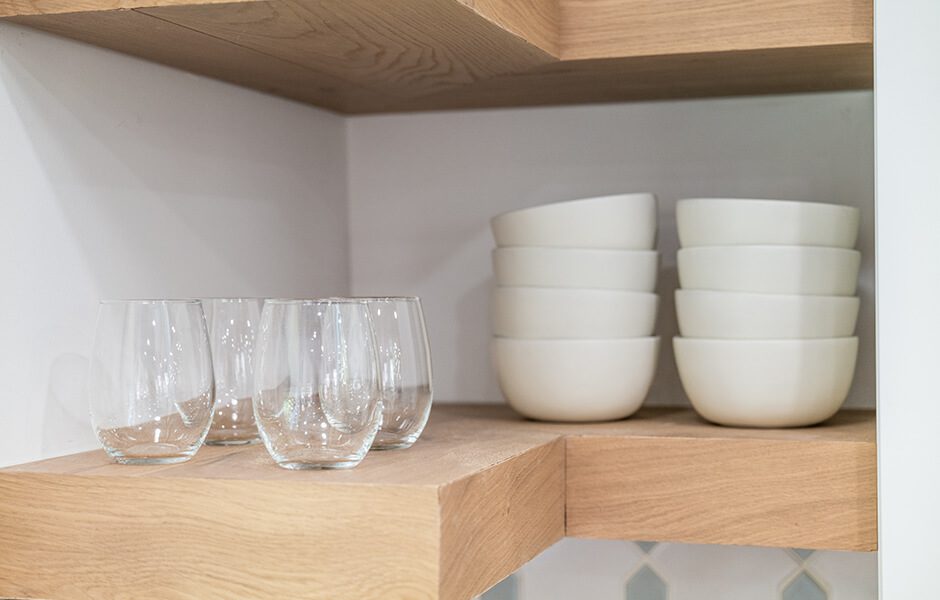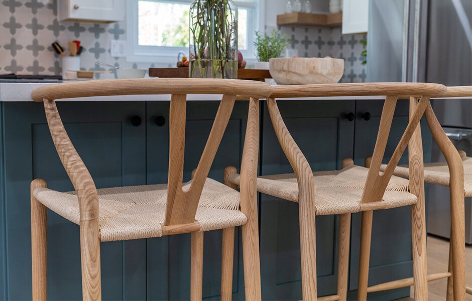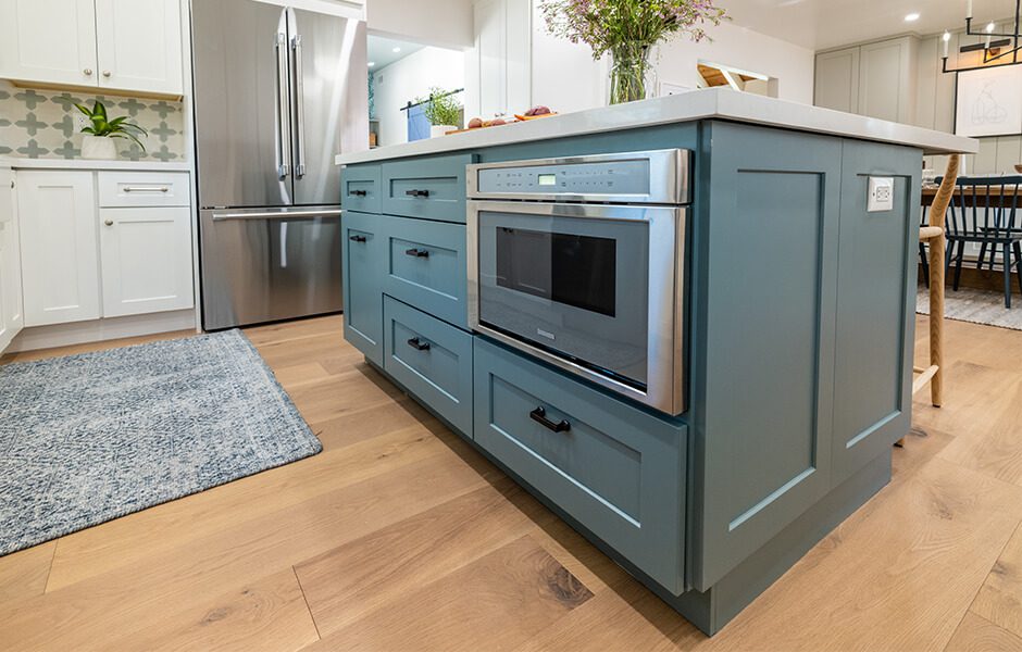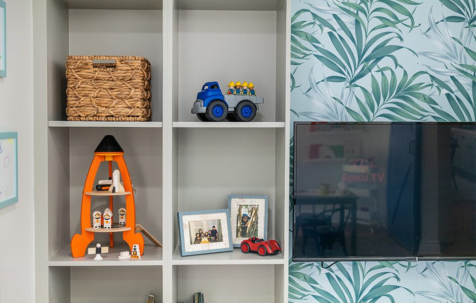 Janet told us she wasn’t afraid of color, but still preferred a mostly white kitchen. No problem at all—that’s what an island is for, right? (In addition to storage, cooking, seating …) Introducing this blue-green hue in the kitchen allowed us to tell a similar color story in the kids’ room, giving the home a natural flow it had been lacking.