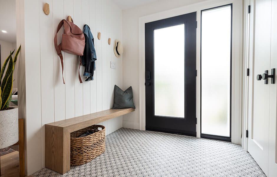 A big issue with the home’s layout hit you as soon as you walked in the door: there was very little room to go, well, anywhere. The tiny entryway led straight into an equally tiny kitchen that couldn’t even house the family’s refrigerator. We opened up the entryway and added a real closet, moving the kitchen to the back of the house. That gave us room to install this custom bench and feature tile, which created a welcoming environment for guests and an easy spot for the little ones to take off their shoes and coats.