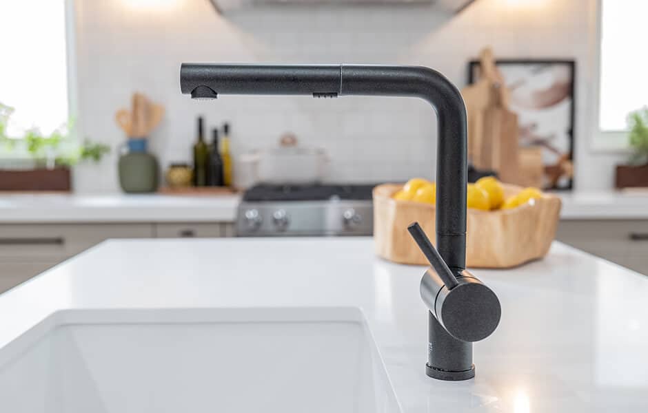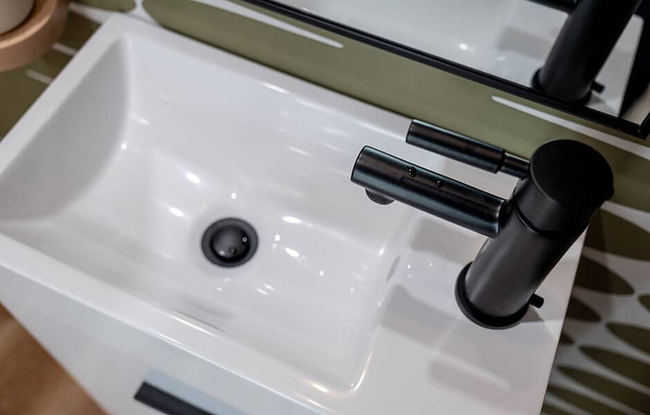 When we presented options for Kirsti and Jeff that pitted a larger office against a second bathroom, it was no contest: the powder room had to happen, so that Kirsti’s clients weren’t traipsing down the hall to the family bathroom. Jeff specifically mentioned he wanted statement wallpaper in the bathroom, so we gave it to ‘em: a modern print from floor to ceiling. Slim fixtures helped us maximize the space, making it feel cozy, not cramped.