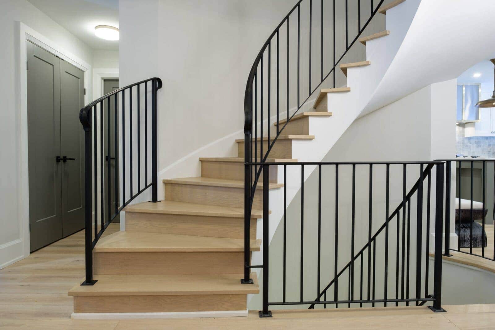 The carpeted curved stairway was looking a little rough, but we immediately saw its potential. We replaced every single tread with solid, stained wood and upgraded the railing from clunky wood to custom wrought-iron. Can you imagine being greeted by this stunned every time you walk into the house?