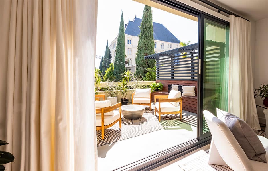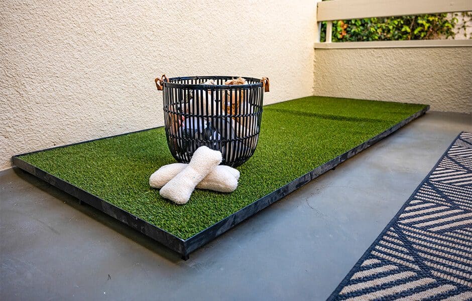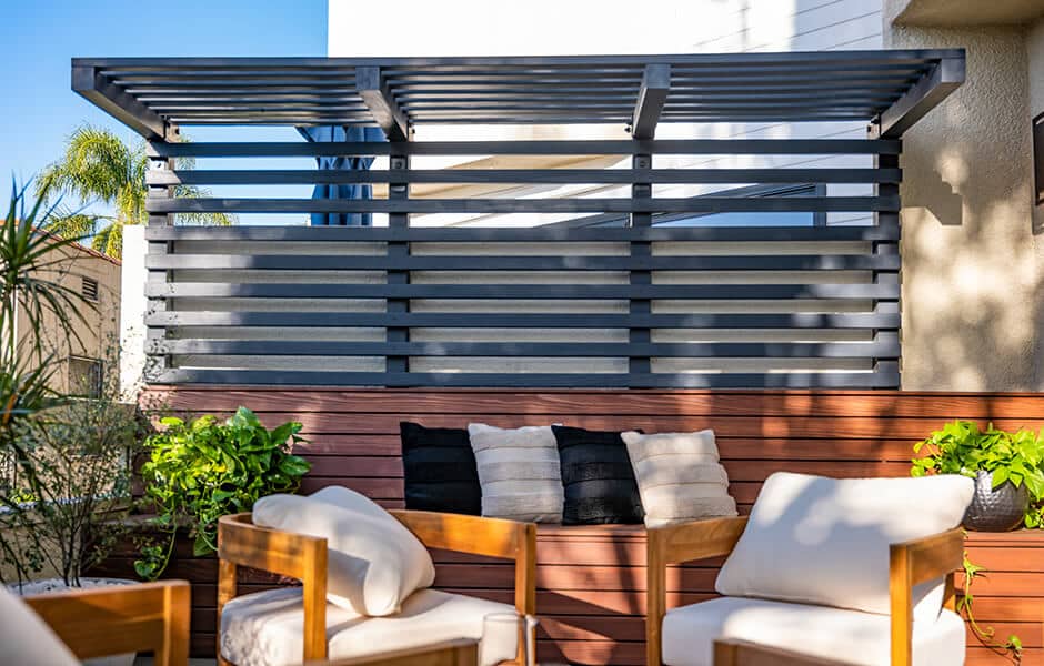 We took the dead space that was Thea’s outdoor deck and turned it into a place all of Thea’s loved ones could enjoy. A canopy-bench provides shade and seating for guests while furry friends can enjoy the grassy pet run.