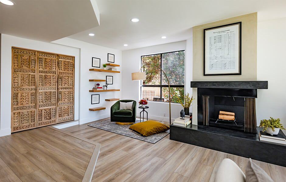 Thea loves collecting vintage clothing, so we decided to add a closet, complete with engraved, decorative doors, to her living room. Then we updated her fireplace by giving it a mantle and a sleek plaster finish.