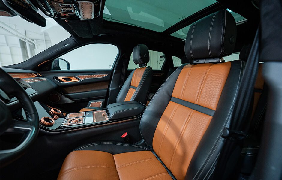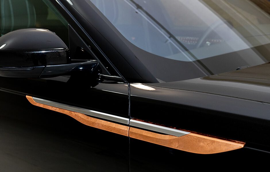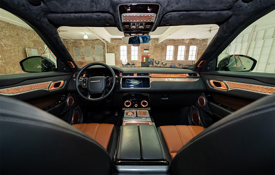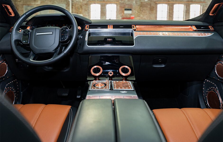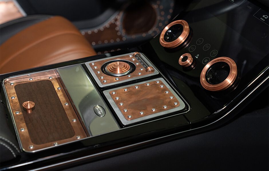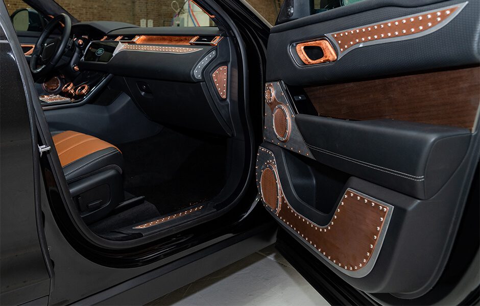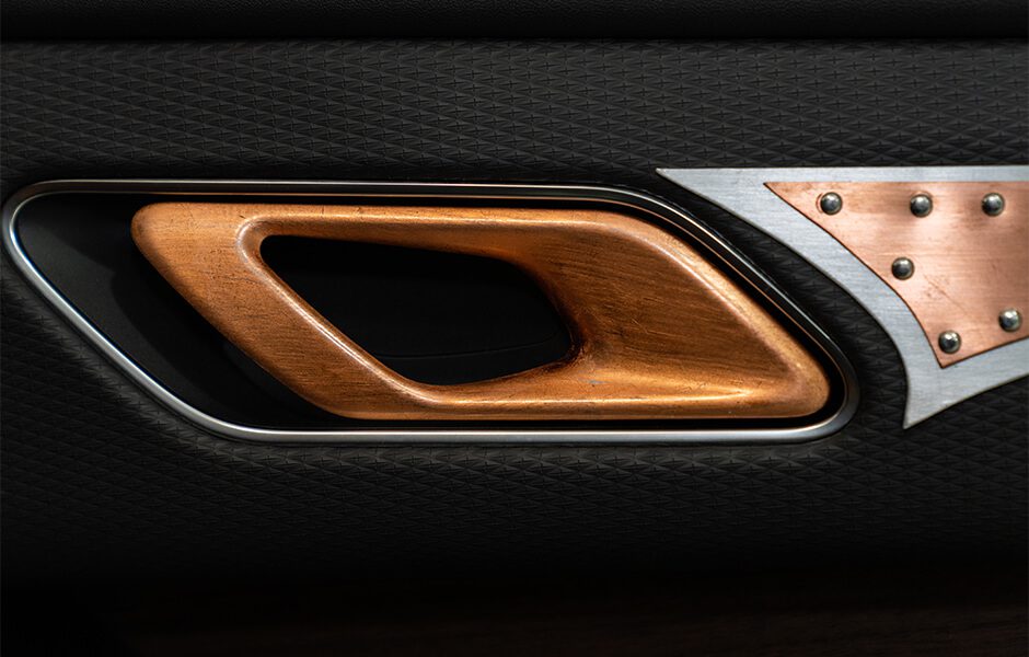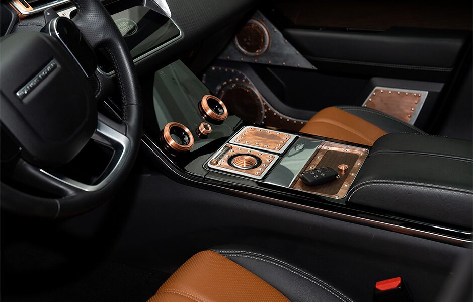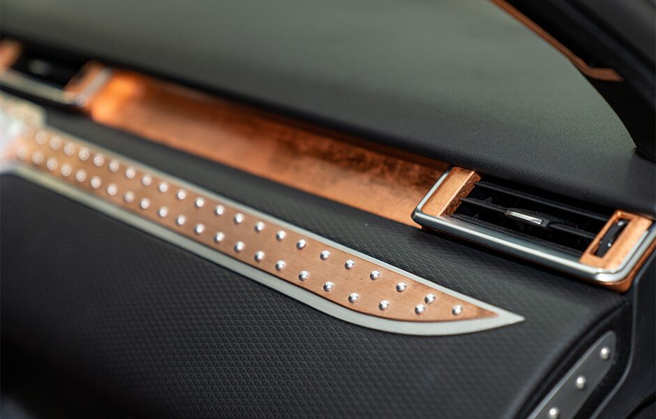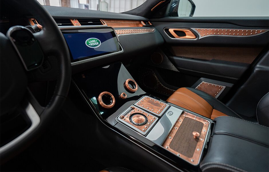 Mary insisted that Nicole would want everything to be simple and low-key, but we couldn’t help giving the outside world a hint of what was going on inside the Range Rover Velar. We replaced this outer trim piece with the same aluminum-copper-sheet metal as a nod to both the interior and Mary’s nail color of the day.