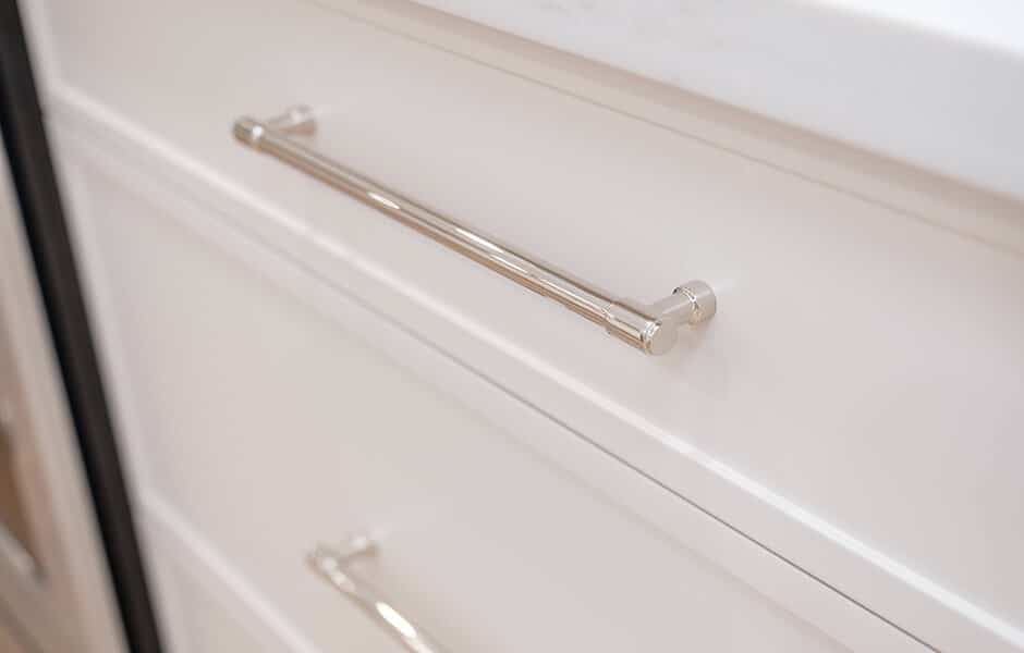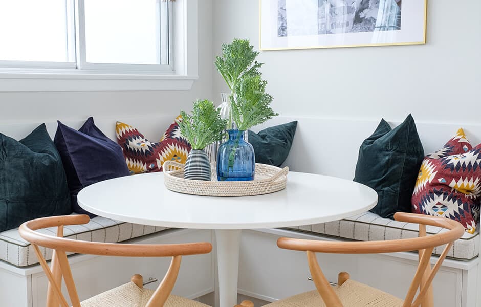 Michelle and Brian wanted multiple seating areas throughout the house, and a breakfast banquette was the perfect way to accomplish the goal. We ran the new, white cabinets all the way over to the seating area so they would have plenty of storage and prep space. With natural light from the window streaming in, this little nook is going to be the perfect place for morning coffee.