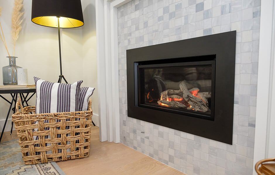 Michelle made no bones about it: she did not like this fireplace. More accurately, she didn’t like how big it was, and once we got into it, we understood why: the bricks were mortared with concrete! Once we got all the old materials out, we surrounded the new gas insert with a patterned tile and low-profile frame, so it wouldn’t stick out (literally). As a bonus, we also replaced the frame on the lovely painting from Brian’s grandmother and hung it with care once again above the mantle.