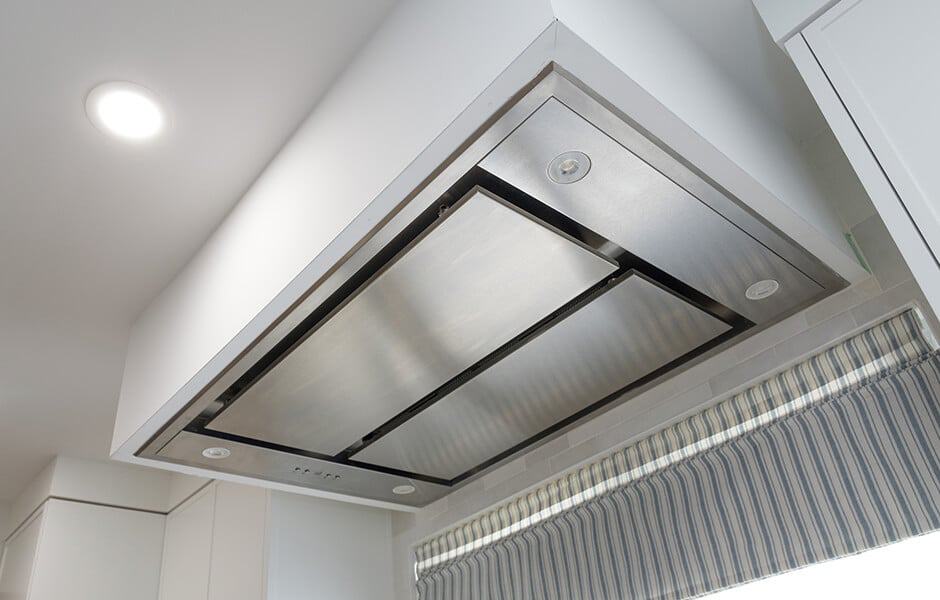 Our kitchen redesign came with a view—namely, the one out the window right above the new induction range. But to keep that view, we had to go way up with the vent hood, and install one powerful enough to make up the distance. We built a special casing to house the vent hood, and kept a clean look that tied the kitchen together.