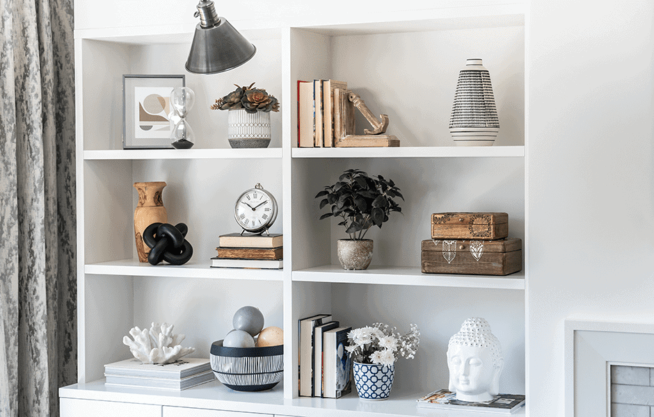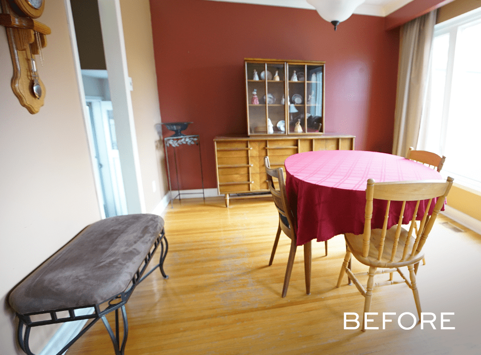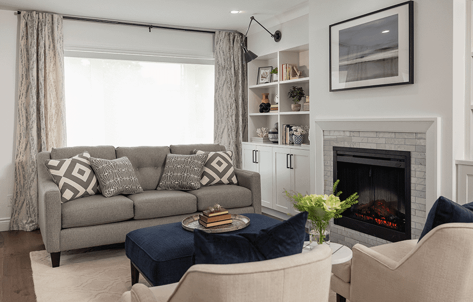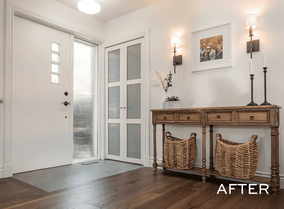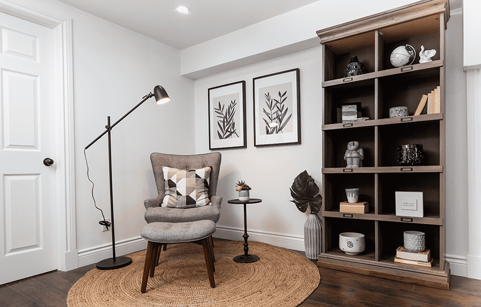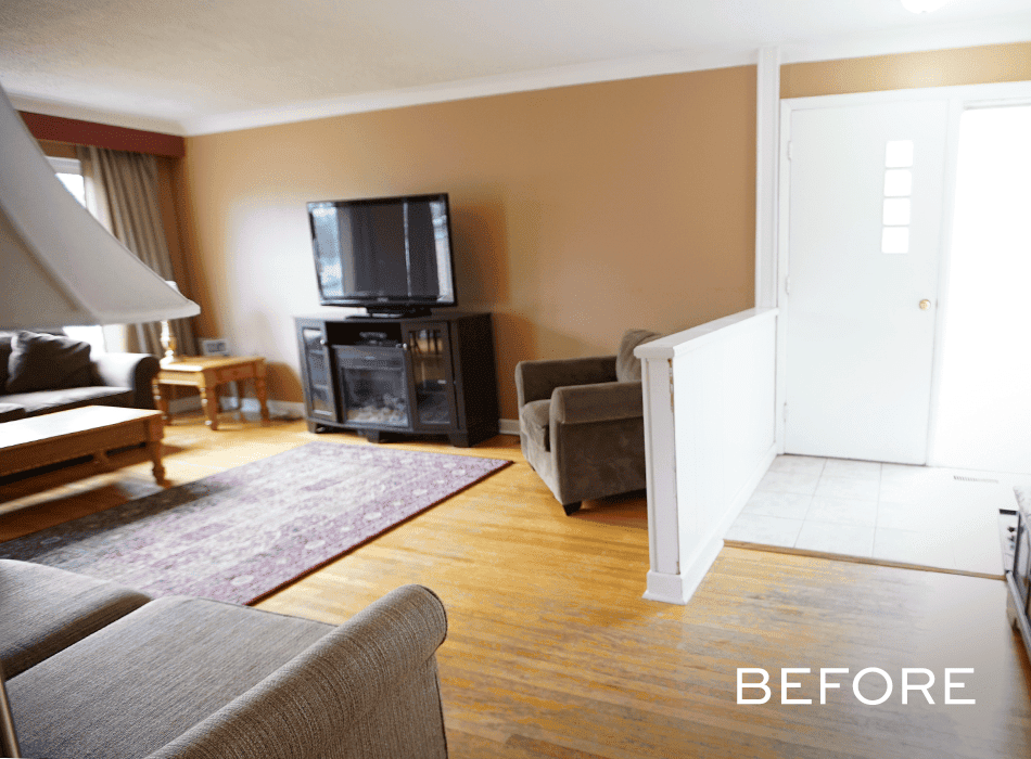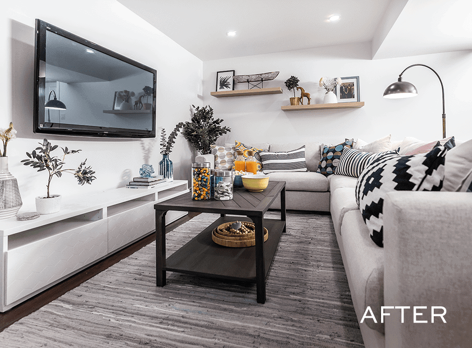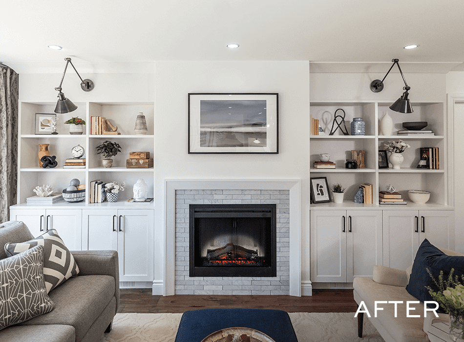 Michelle and Chris had a choice to make: they could add a second bathroom downstairs, or create a feature wall in the living room to make the space more inviting for guests. They chose the living room feature wall, which turned out to be just what the space needed to draw guests into the home. Built-in shelves provide great storage space and a conversation piece, while an electric fireplace and new, inviting furniture add warmth and coziness.