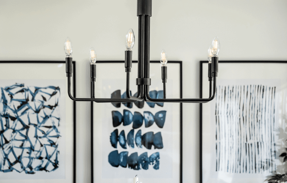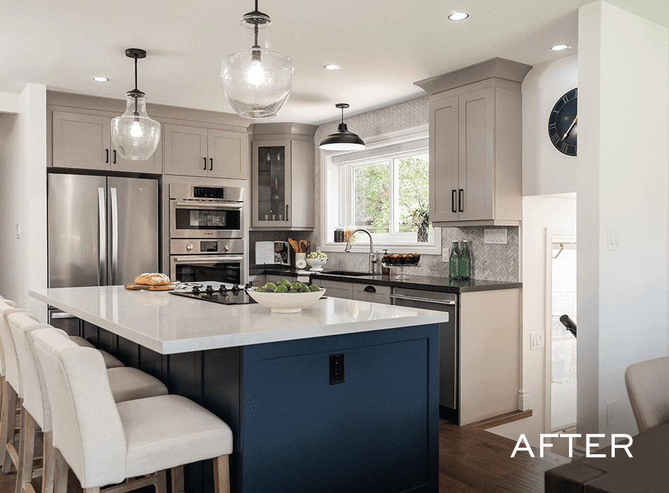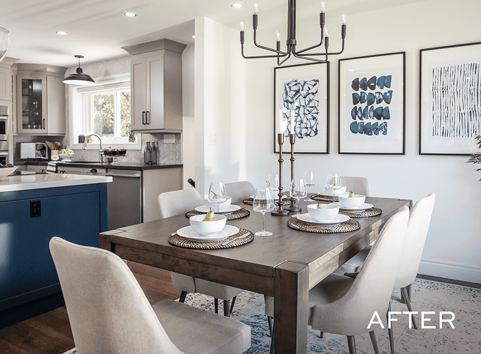 The kitchen needed the most love in the house: the cabinets were an unwelcoming shade of brown, and the noise from the overhead fan was … very creepy. But after we took down all the walls that separated the kitchen from the rest of the dining and living area, we had a wonderfully open space for Michelle and Chris to have the kitchen of their dreams. Those dreams thankfully included lots of contrast: two-toned cabinets and countertops that were different but complementary. A stunning blue on the kitchen island carried over to artwork in the dining room, tying the spaces together in a modern but welcoming way.