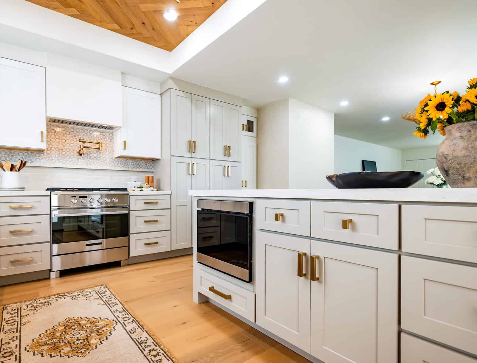 The slight variation in color between the cabinets makes all the difference, creating a subtle contrast that gives the room interest. Sleek stainless steel appliances and a pot filler are just a couple of the upgrades they added that give this kitchen a modern touch.