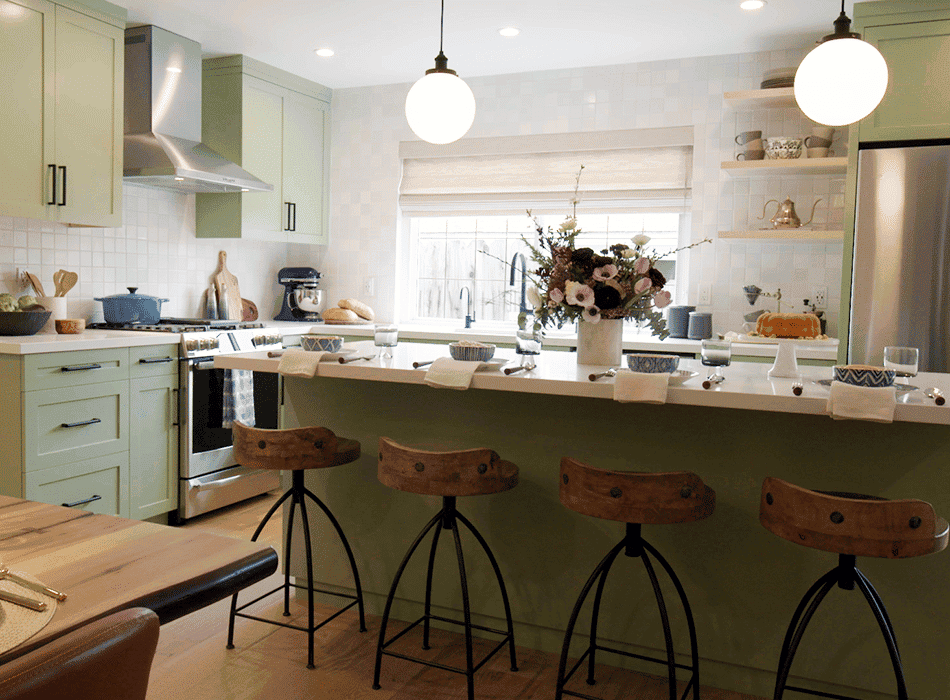 Swapping the location of the dining room and kitchen created a more functional working triangle—that’s the stove, sink, and fridge trifecta—and allowed us to include an island large enough to seat four. Then we had to figure out how to blend Nora and Diego’s love of both color and rustic elements. After much discussion, we chose an earthy green for the cabinets and balanced that standout color with white tile and warm wood tones. Black hardware, plumbing accessories, and lighting bring a touch of modern elegance—and more energy—to this elevated space.
