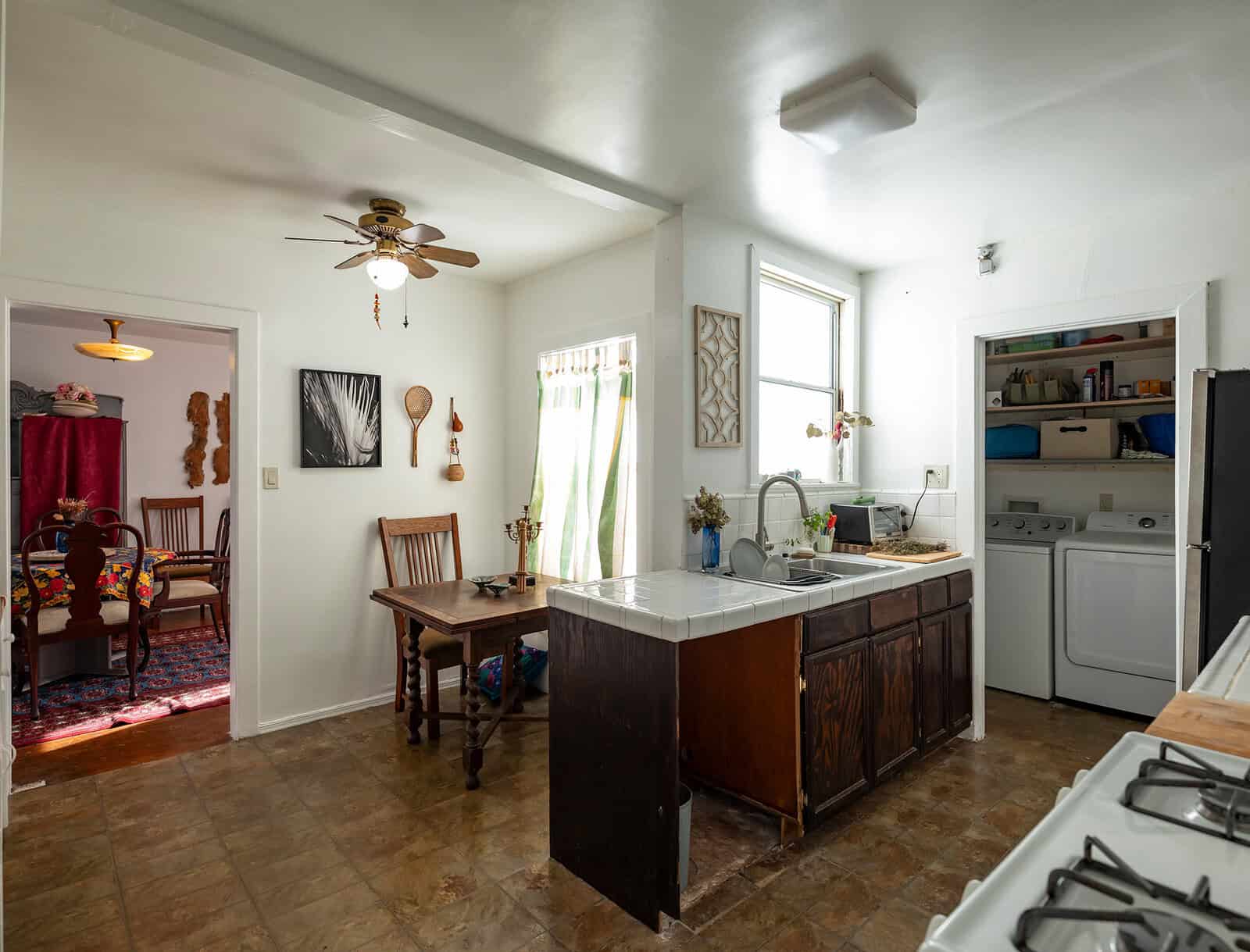 The Bros and Patricia decided to make use of closed storage with pull-down cabinet shelving to keep Liz’s laundry tools easy to reach, as well as a front-load washer and dryer and custom pull-outs for her laundry baskets.