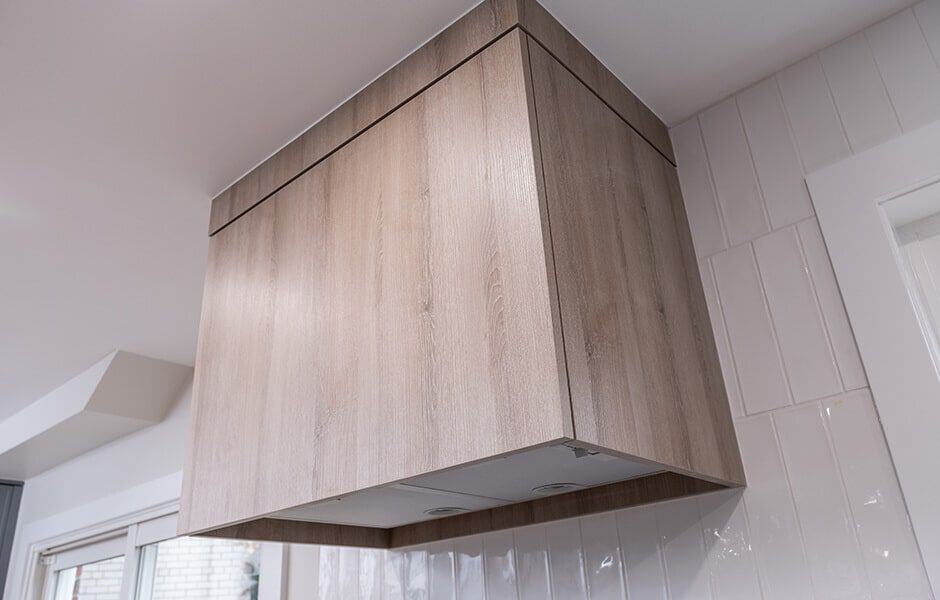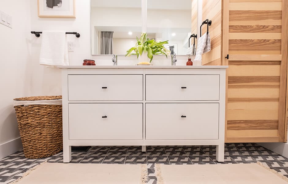 A larger-than-expected beam meant a smaller-than-expected budget, so we went with this off-the-shelf option for bathroom storage. As you can tell, it turned out great and blended well with the custom pieces we placed around it. Plus, it gave us bonding time while we tried not to lose a screw (figuratively and literally).