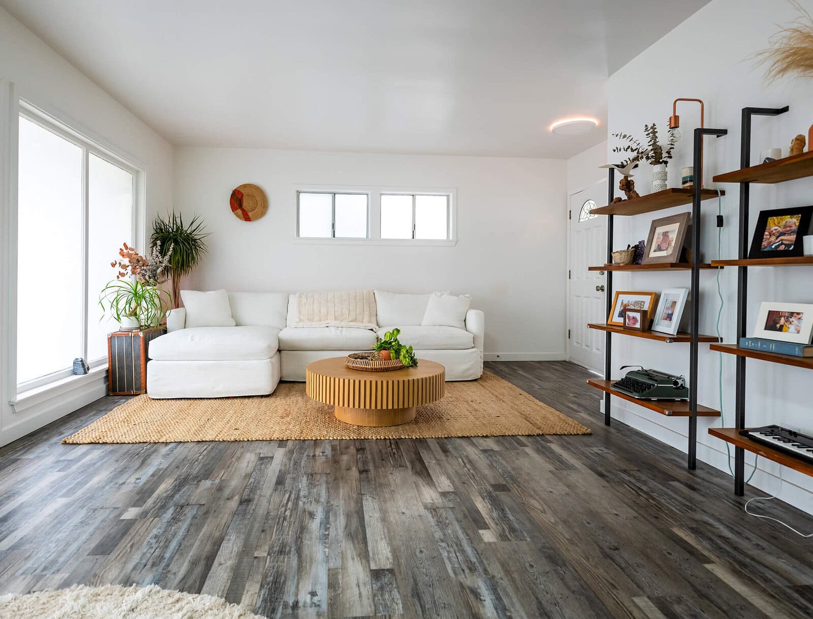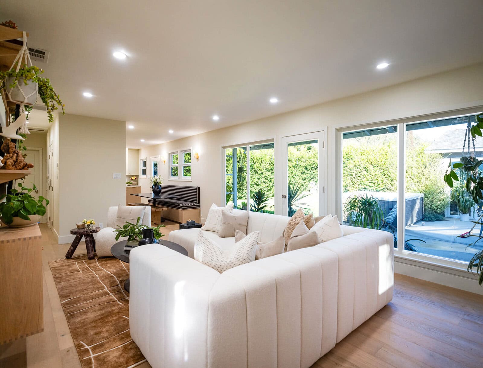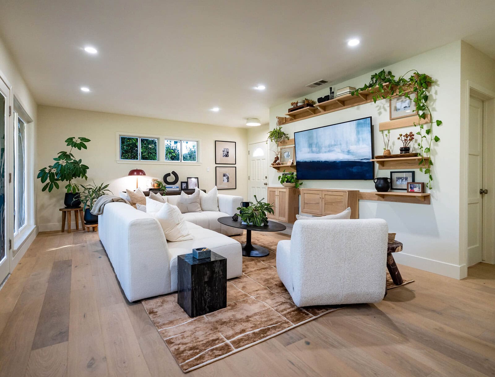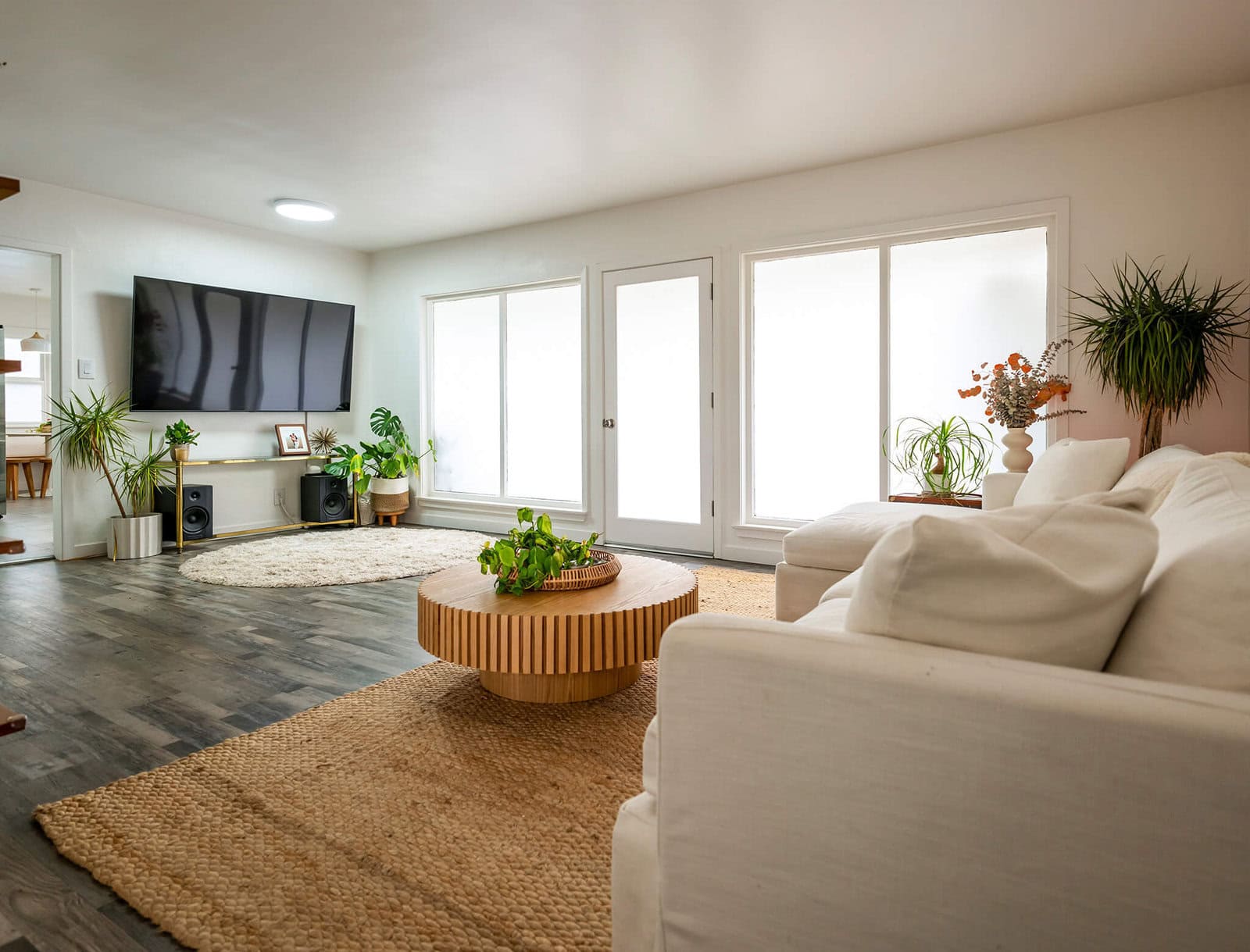 Knocking down that wall also gave them plenty of room to reimagine the living room layout. Originally, the sofa was way too far from the TV, and it made the room appear awkward. By fixing the TV and media console against the wall opposite the sliding glass doors, they were able to carve out a place dedicated to entertainment while making better use of the space.