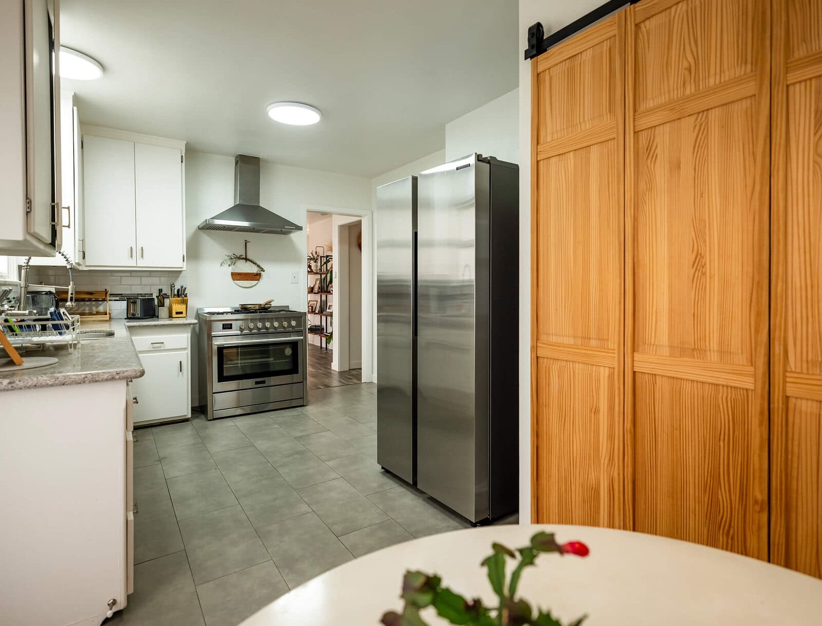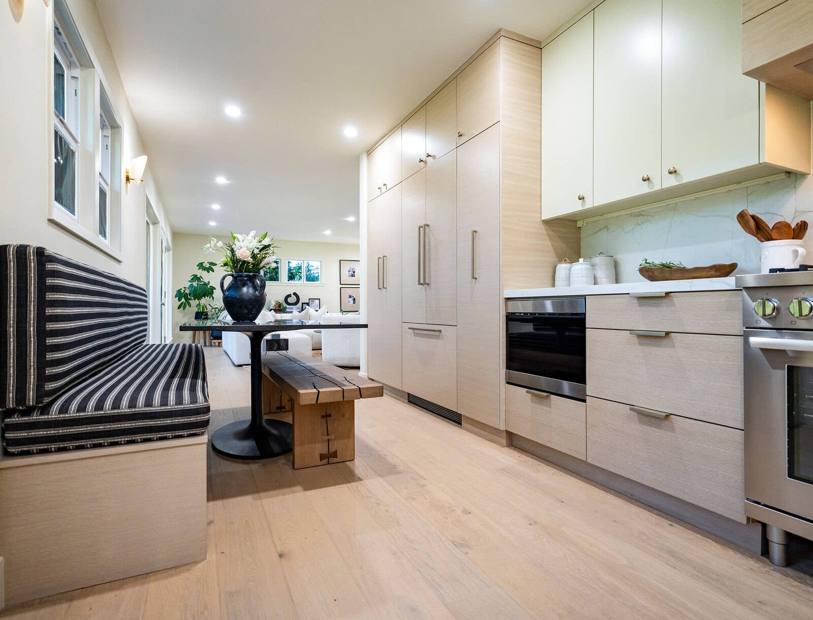 Goodbye, cramped kitchen and hello, open space! After knocking down the awkward wall separating the kitchen and living room, the layout immediately felt so much bigger. They were able to take cabinetry and closed storage all across the wall and rearrange the appliance placement for more sensible functionality. They added in a banquette, perfect for early mornings and homework time, and were able to add in better lighting for cooking, too.