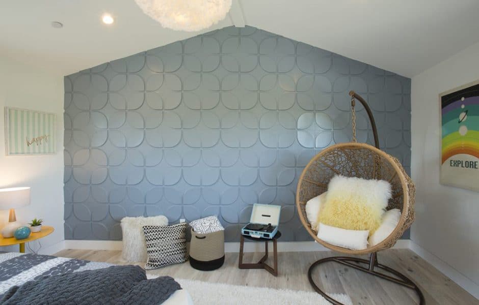 Accent walls don’t always have to be done with tile or wallpaper. I took an eco-chic chance on these decorative 3D acoustic panels made of bamboo fiber, which I painted a blueish-gray and then applied with contact cement. The resulting statement wall provides texture and color in addition to showing off the room’s sky-high ceiling.
