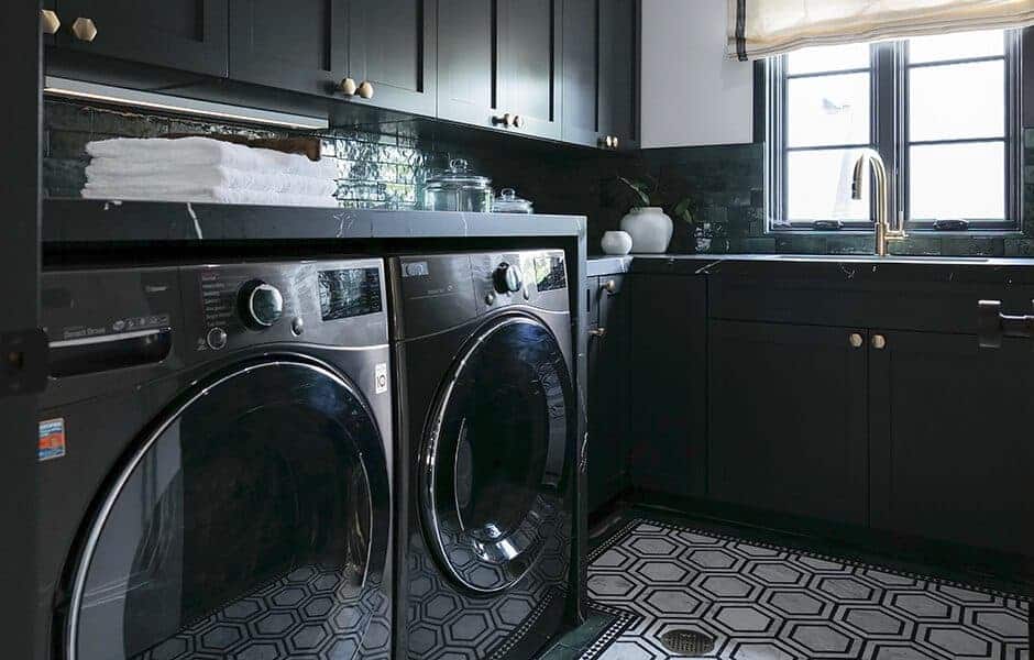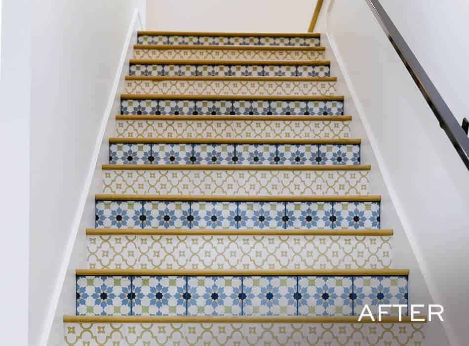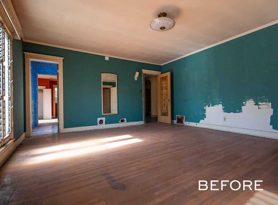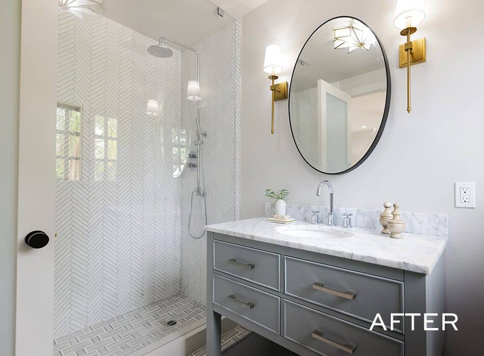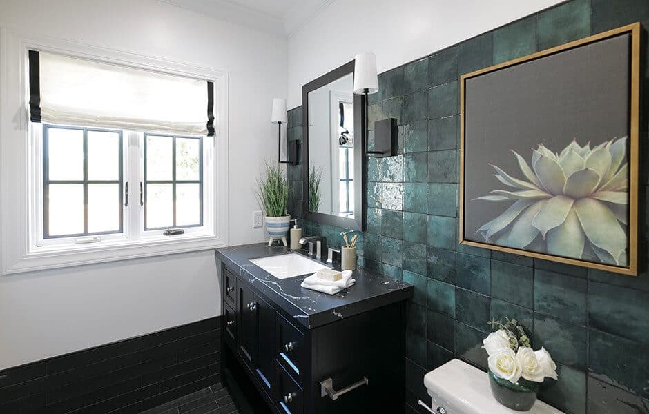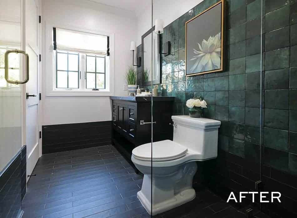 We’re back to bold in the guest bathroom! This emerald green tile runs from the sink to the shower and holds its own with our print-heavy guest bedrooms and our dramatic powder room. This high-end feel is exactly what potential buyers in this neighborhood will be looking for in every room, and this bathroom will not disappoint.