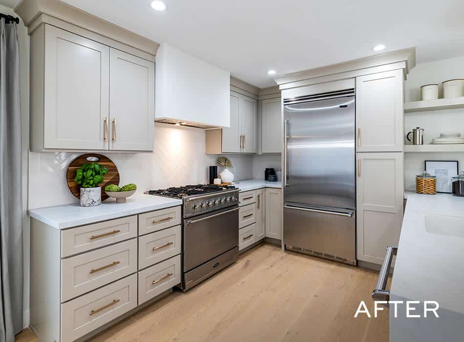 Selena loves to cook and entertain friends, so while renovating the kitchen, we took out the kitchen window and moved the cooktop to its spot. Now, the statement hood is still a focal point of the space, but she has a lot more cabinets and countertop space to work with. With the new lighter accents and flooring, the lost light isn’t even noticed.