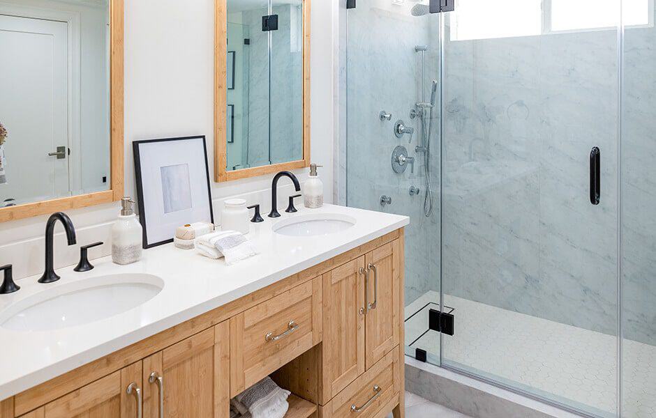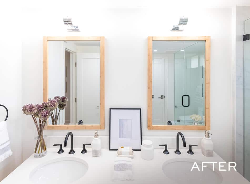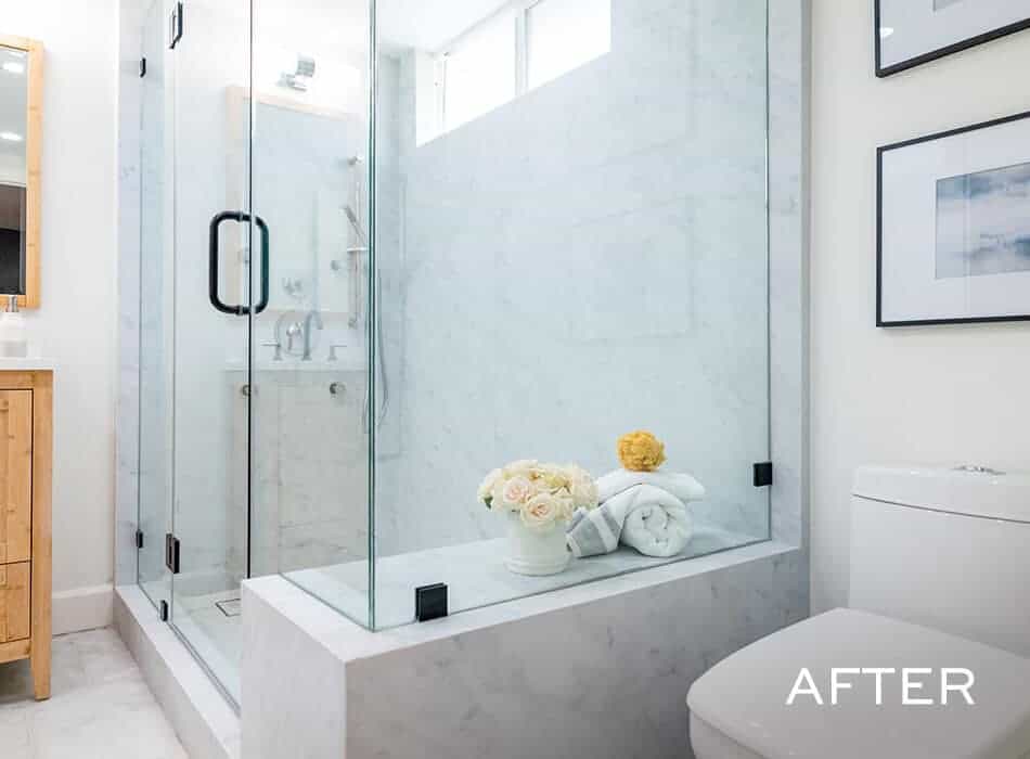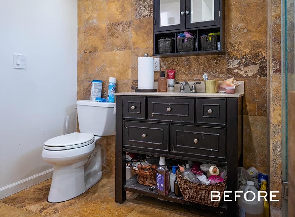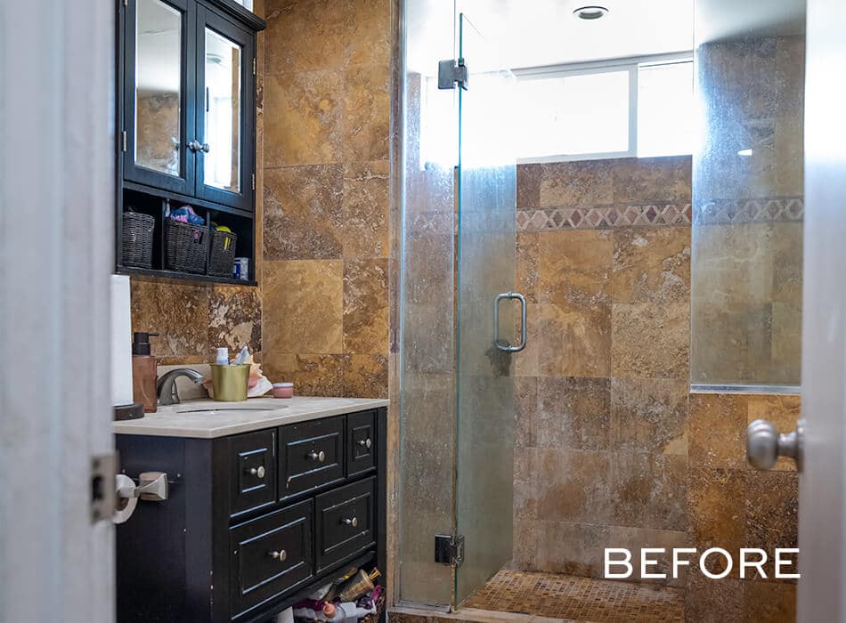 Tiffany was determined to help transform Selena’s guest bathroom into a spa-like oasis she could relax in. First, we replaced her dark, blocky, shower with an elegant glass enclosure. Then, we were able to move the toilet next to the shower and add a spacious double vanity.