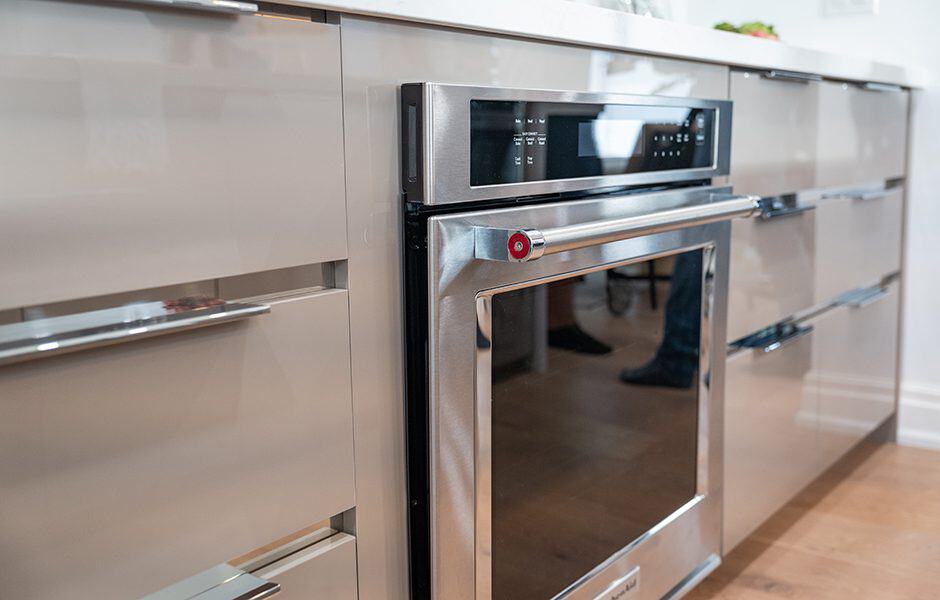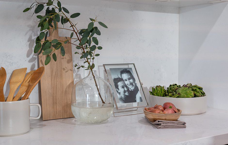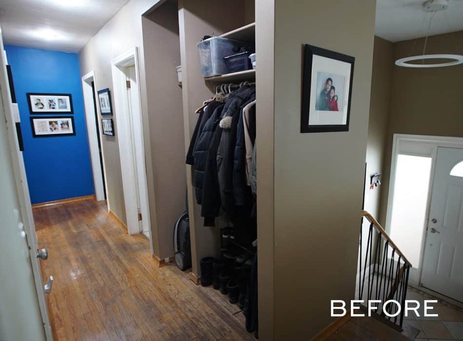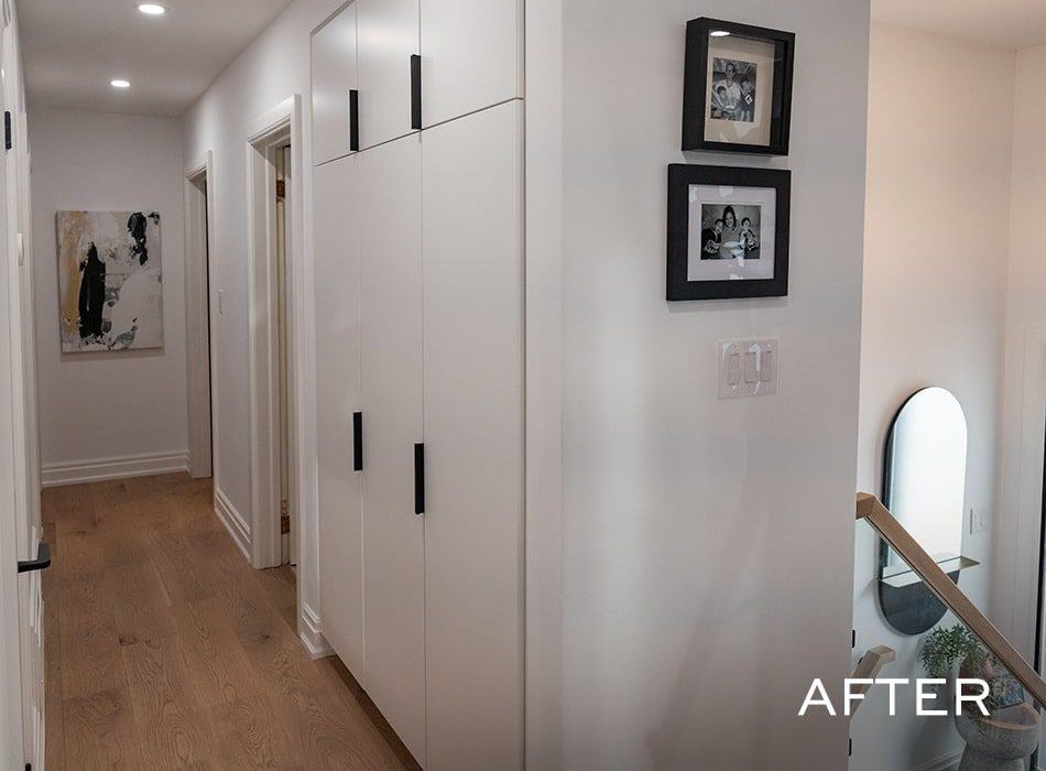 The key word throughout Vanessa and Michael’s renovation: contrast. Vanessa wanted a white kitchen, while Michael wanted some differences in tones throughout the house. We landed on white quartz countertops that look like marble to provide interplay throughout the design, and darker cabinets underneath that accent their brand-new stainless steel appliances (including the dishwasher they never had!). White floating cabinets with black hardware provide the perfect theme to continue into the hallway, where we redesigned the coat closet to finally finish a long-abandoned DIY project.