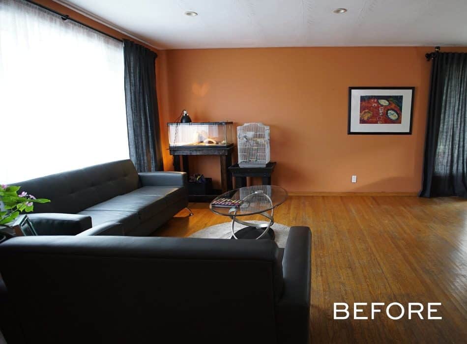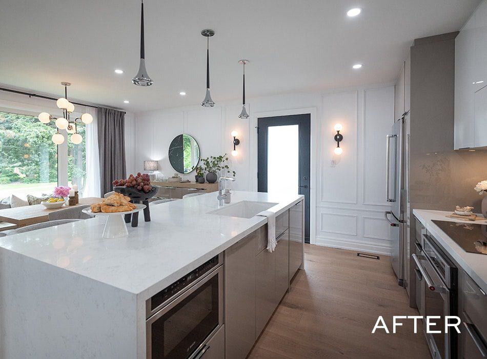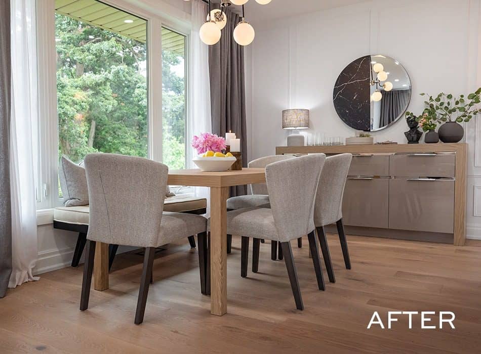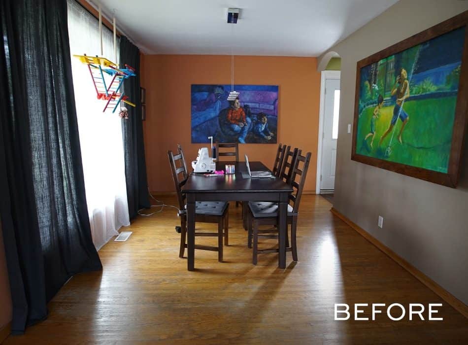 The dining room table had become the workspace and gathering place for the family. But the space was small and very dark, with a wall that cut the room off from the kitchen. In order to make the dining room feel bigger and cozier at the same time, we knocked out that separating wall and added a sideboard to give them additional storage space. We highlighted the picture window with new curtains and a bench that can be used for mealtime or just a spot to read a good book. Light hardwood floors and our continued white paneled walls from the living room turn this space into a bright feature.