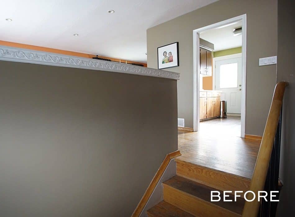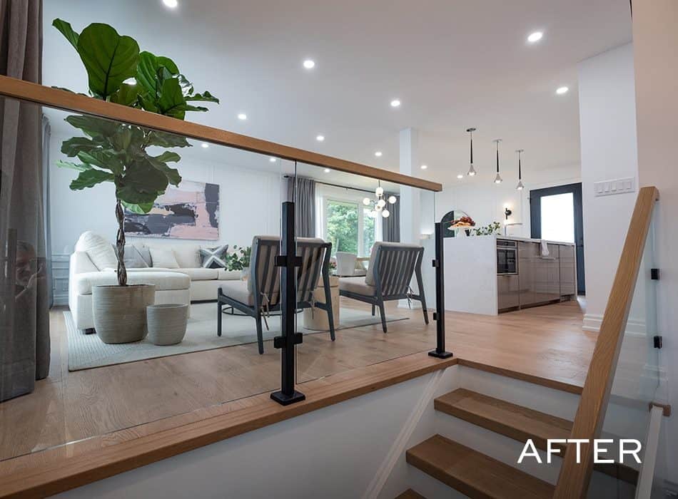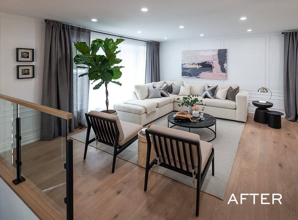Vanessa and Michael’s upstairs living room had quite the combination: beat-up hardwood floors from years of tough kid treatment, but untouched and unwelcoming furniture. The only family member who spent much time in the room was Cole the cockatiel! We set the tone for the space from the literal first step, with bold marble tiles in the entryway for a dramatic statement. Glass railing allows a peek at our new wall paneling, which creates clean lines to draw the eye to the redesigned living room. A comfy sectional sofa now beckons the family to spend quality time together, just like they did when the boys were younger.