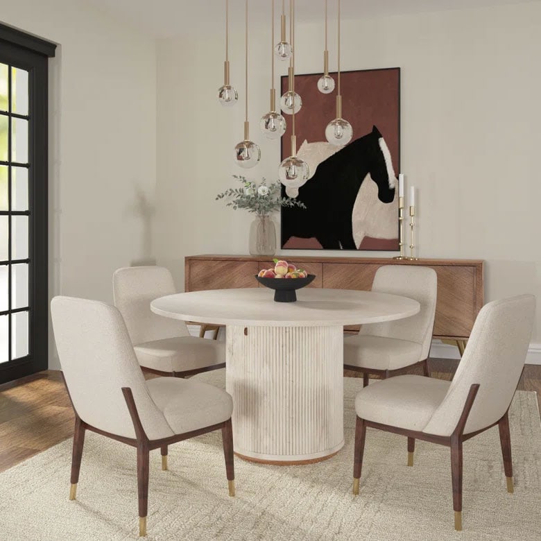 A few things are essential for a well-executed dining room. First (and most obvious), you need a dining set! You could go with a matching set or mix it up with a table and chairs of your choosing. Then you’ll want to layer in extras like accent cabinets that can store hosting essentials or extra dinnerware, or even bookshelves that can display conversation starters. A chandelier makes for excellent dining room lighting and an area rug can tie the whole look together. (Though we might encourage you to consider washable rugs to save yourself a headache.)