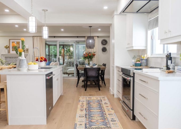 Open dining and kitchen area with a wooden table, black chairs, and vibrant decor accents